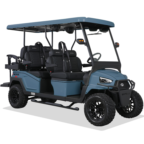 The Nexus is powered by a range-extended 72v drive system and is packed with more standard features than any other cart at its price point. Complete with a 13" high-res infotainment center, roof-mounted fans, lights, and speakers, a beach chair holder, LED accent lighting, and lockable storage. The Gen2 adds power steering, adjustable camber, color-changing under mounted lights, push-button start, and so much more… be prepared to be the talk of your neighborhood with the all-new Bintelli Nexus!